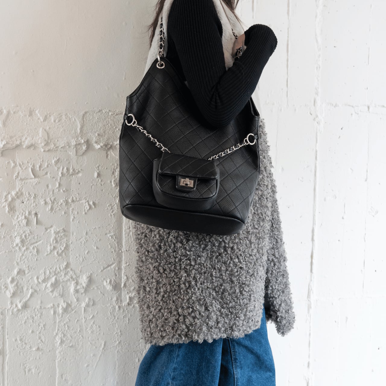 ・本革のキルティング加工×シルバーチェーンが、エレガントな雰囲気を演出。