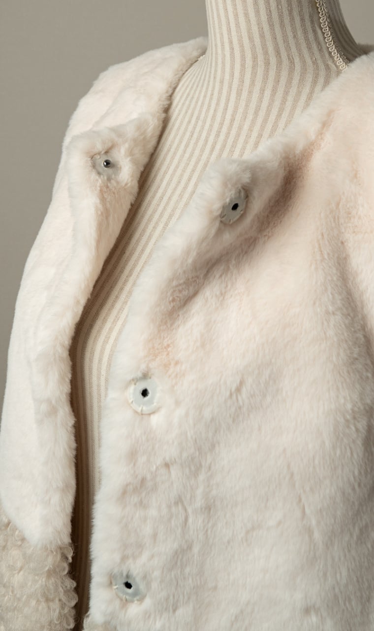 ふんわりとしたフェイクファーとカール調のボアを切り替えた、上品で高級感のあるロングベスト。