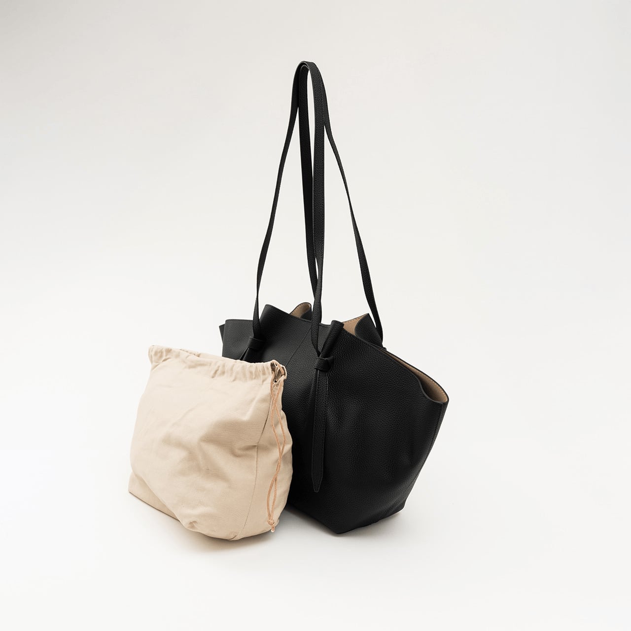 ふんわり広がる優雅なドレープシルエットと、肩掛けしやすいロングストラップが上品な印象。