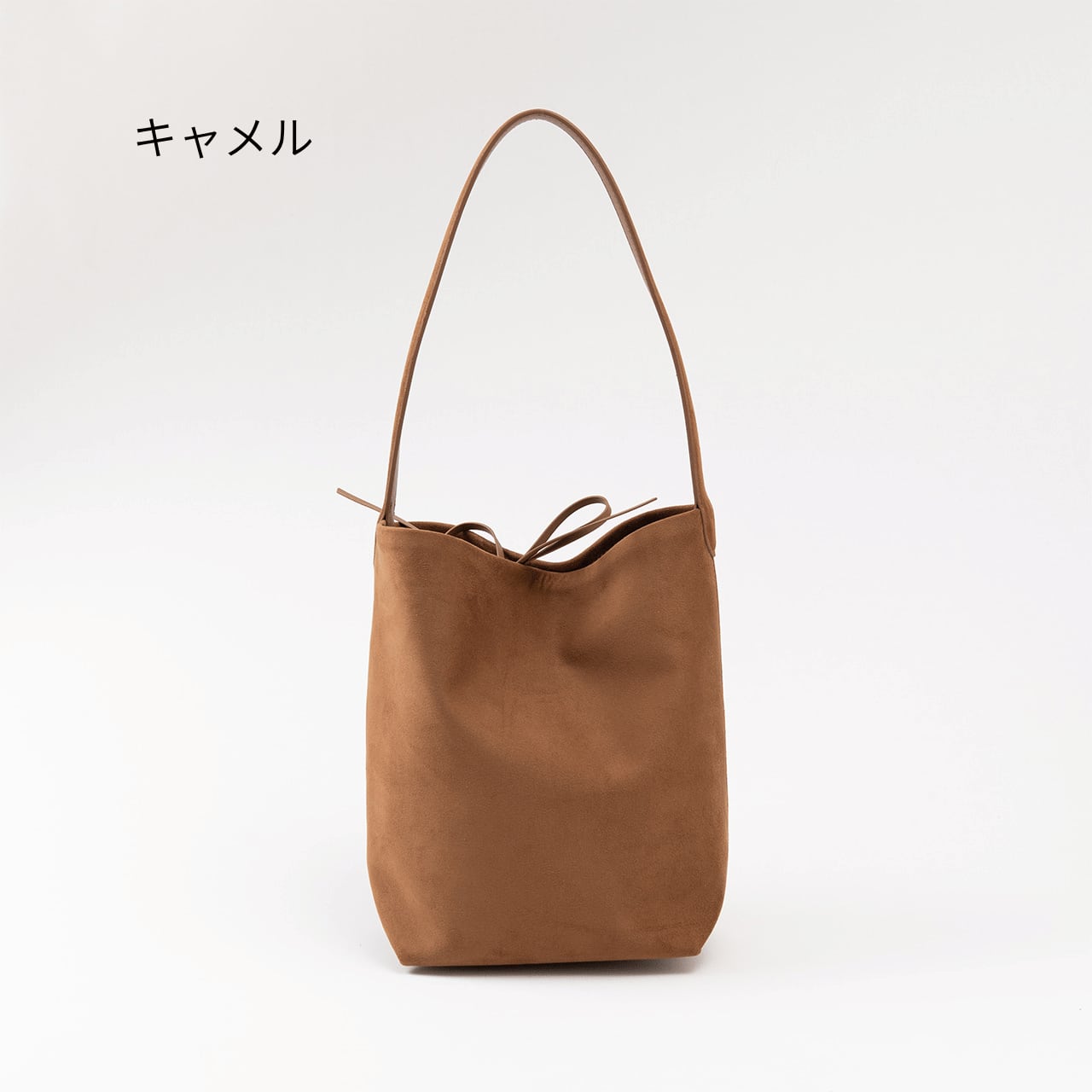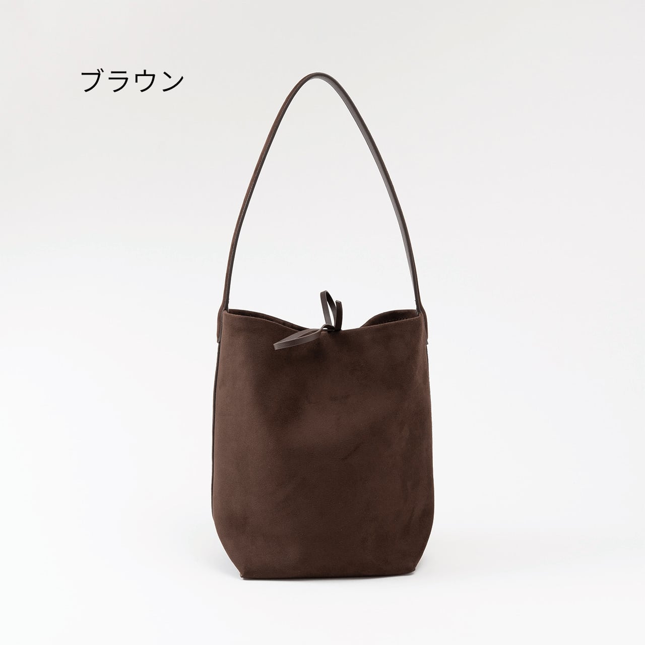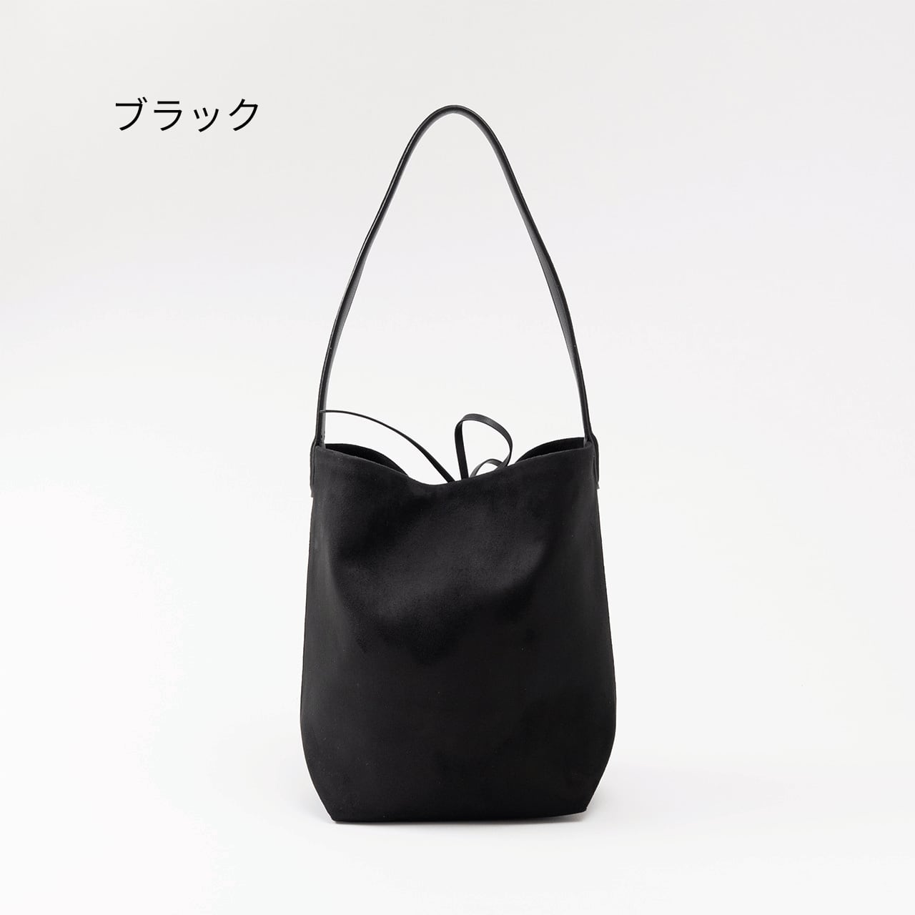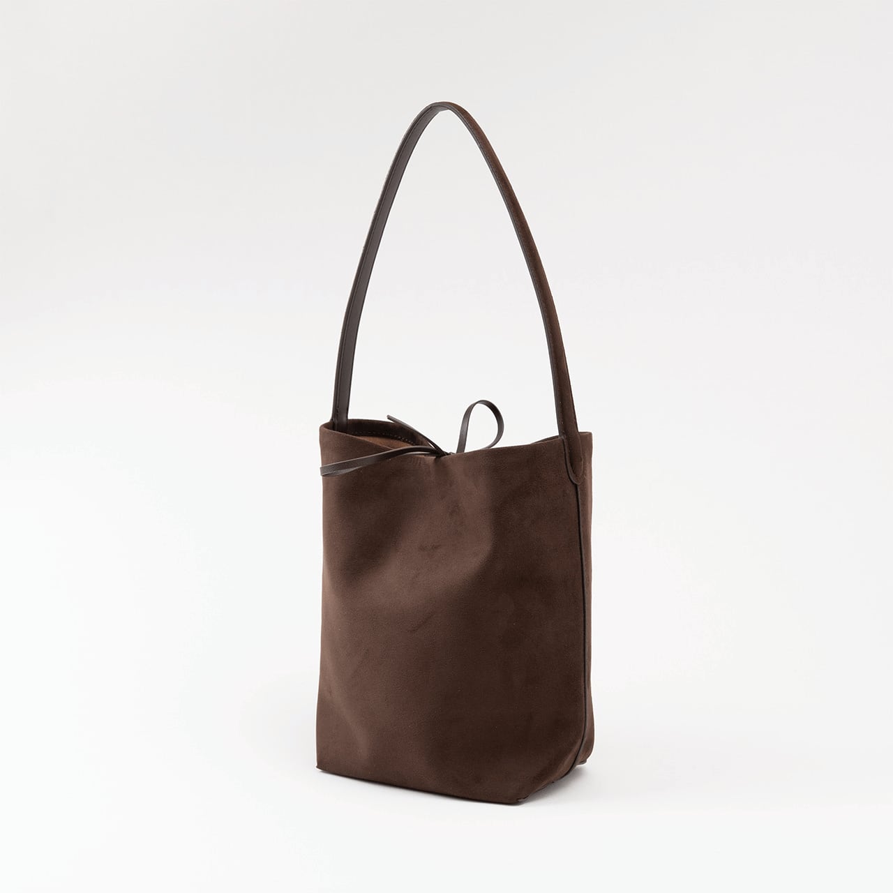 表情豊かなヌバック素材を使用した、縦長シルエットが美しいバケットバッグ。