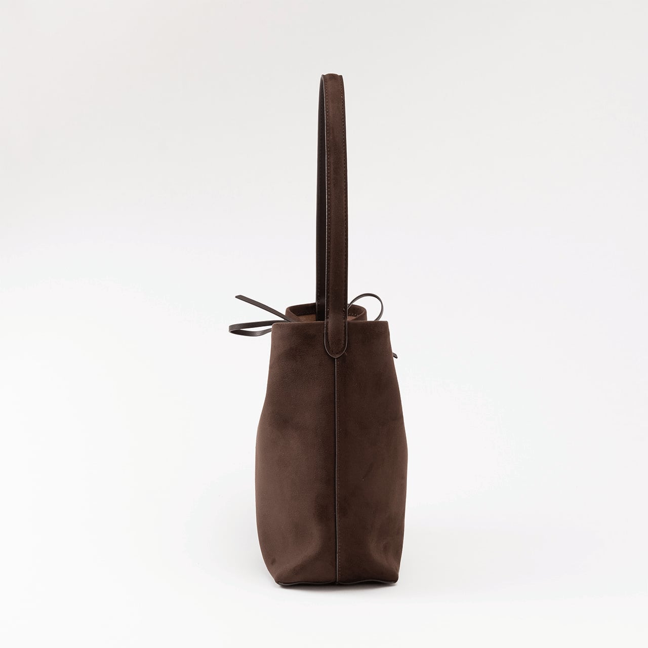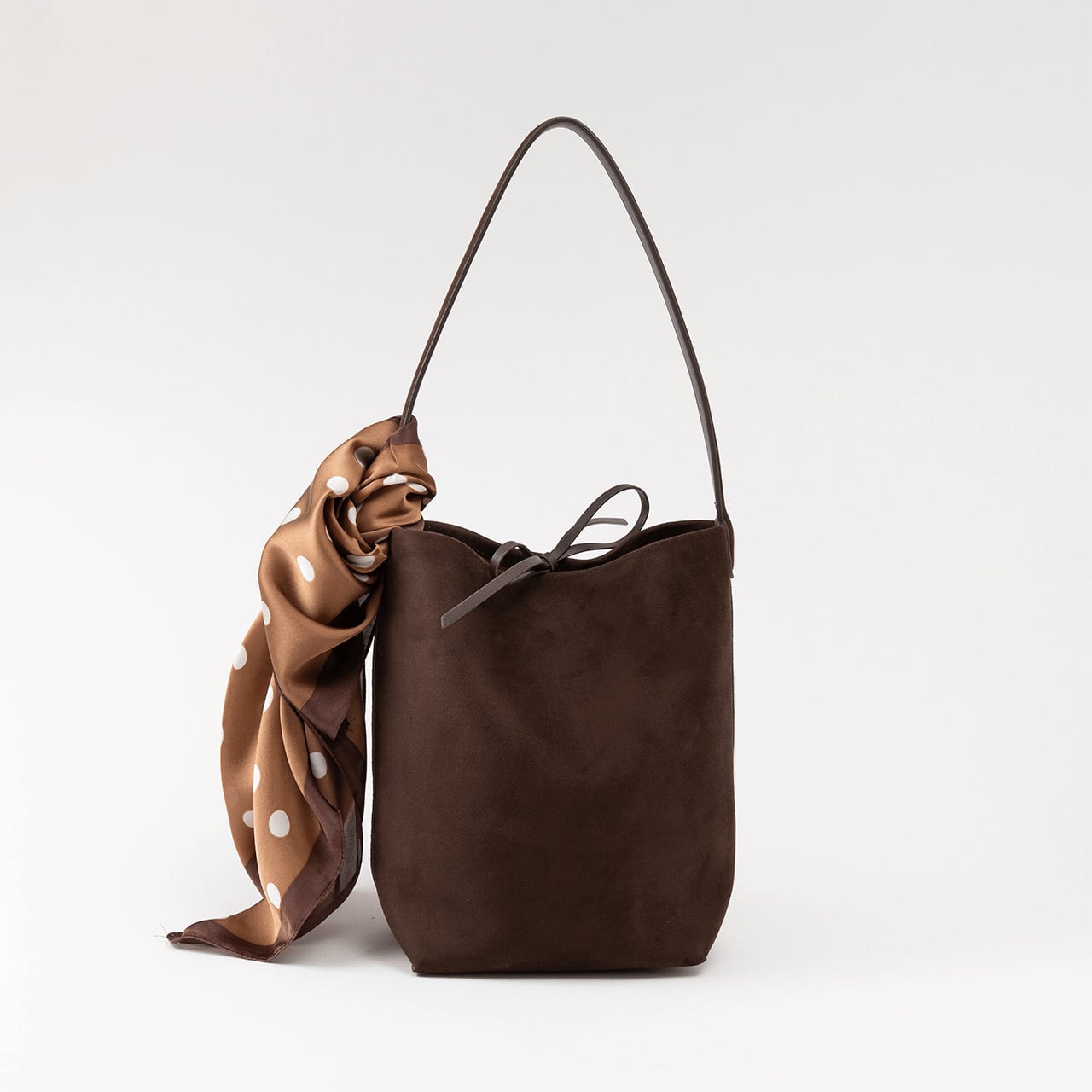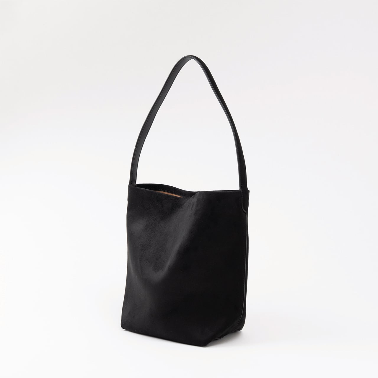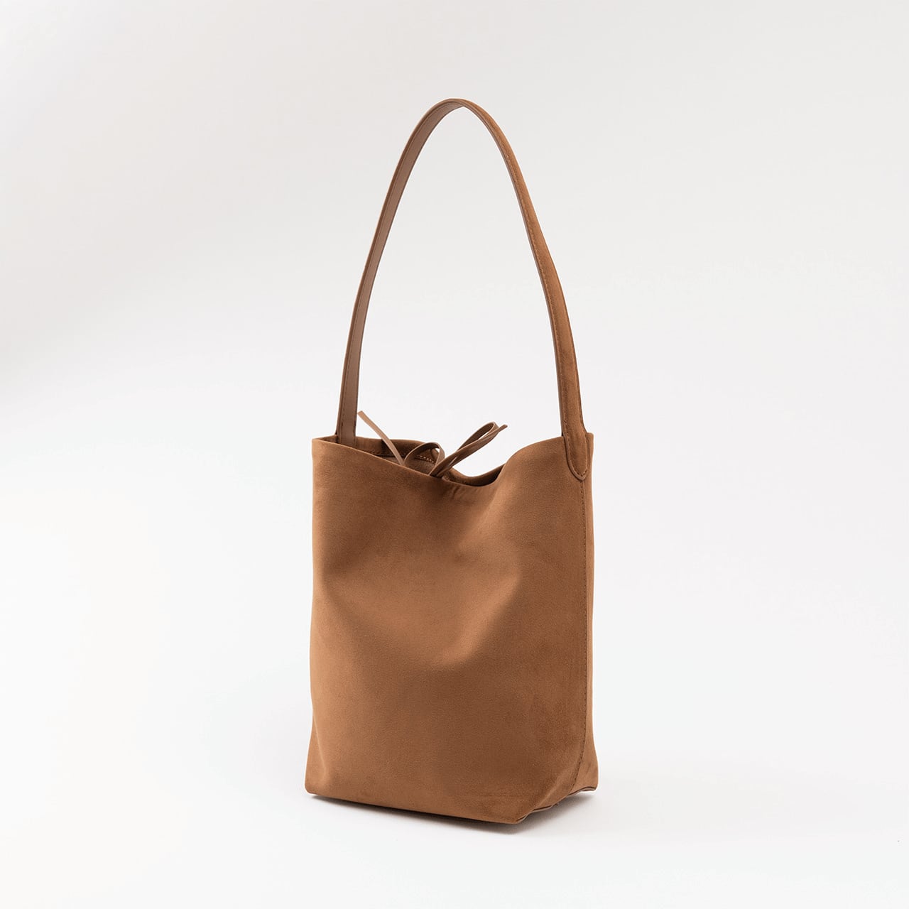 表情豊かなヌバック素材を使用した、縦長シルエットが美しいバケットバッグ。