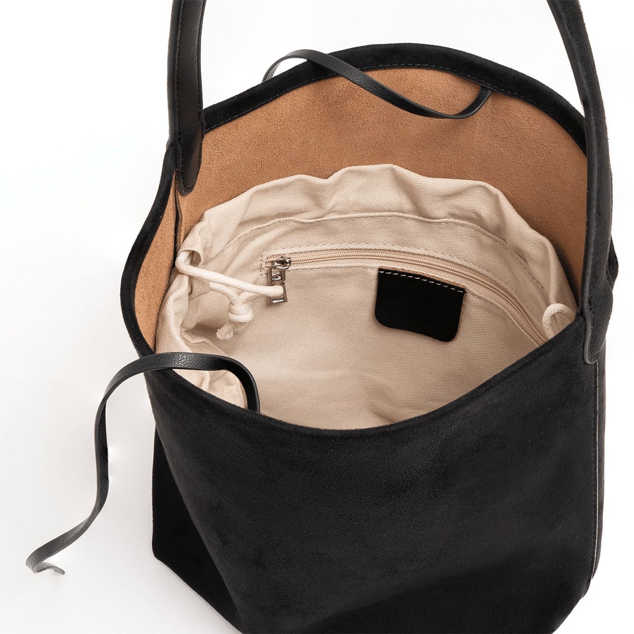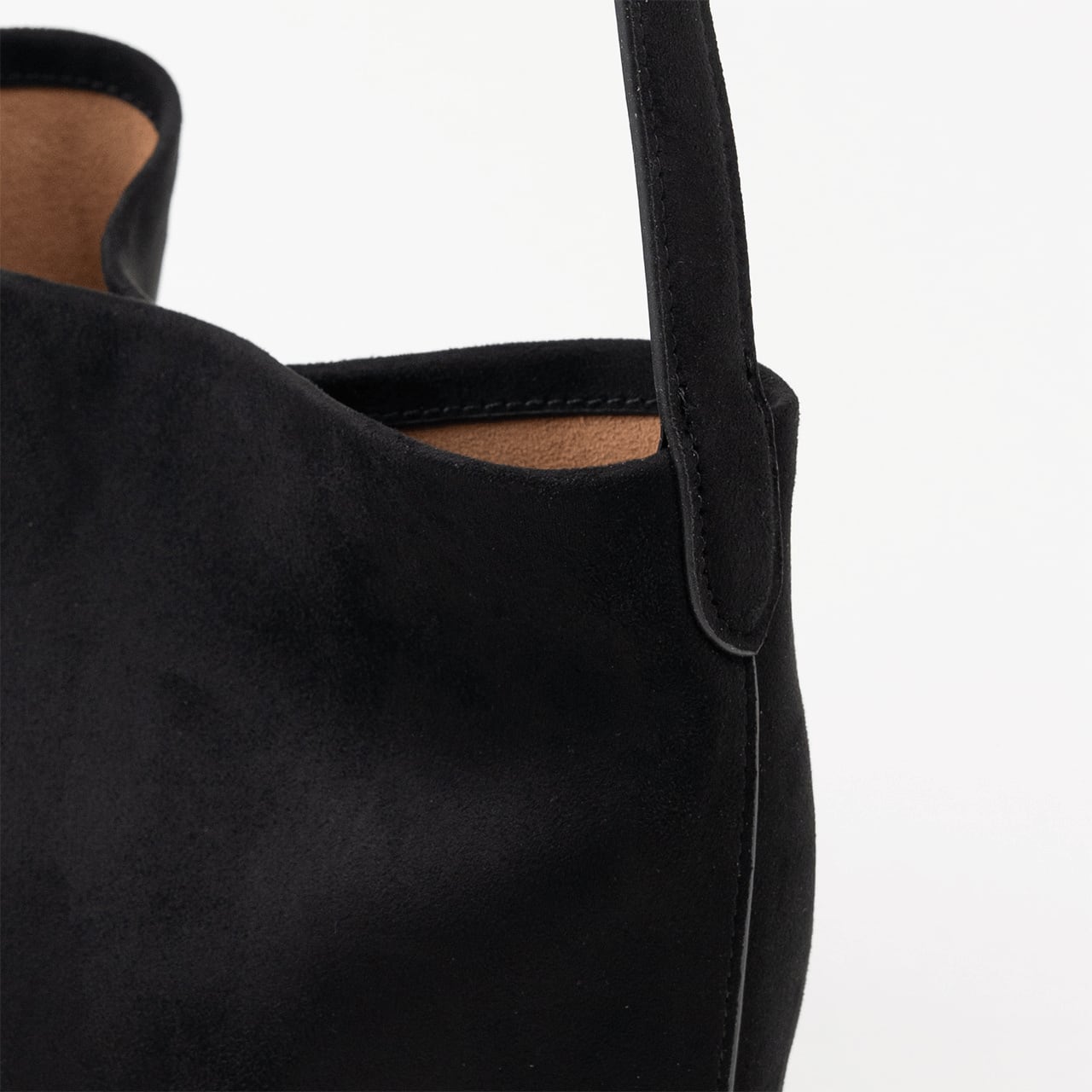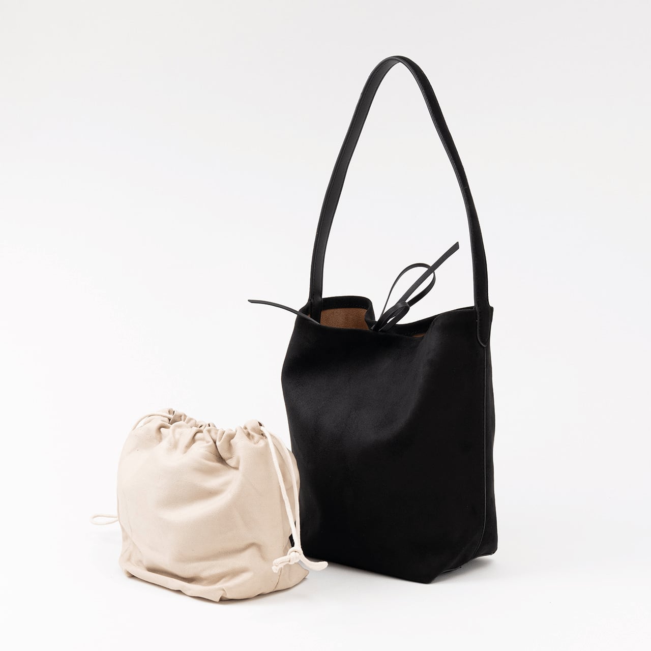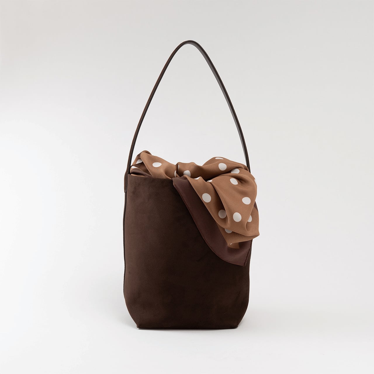 表情豊かなヌバック素材を使用した、縦長シルエットが美しいバケットバッグ。