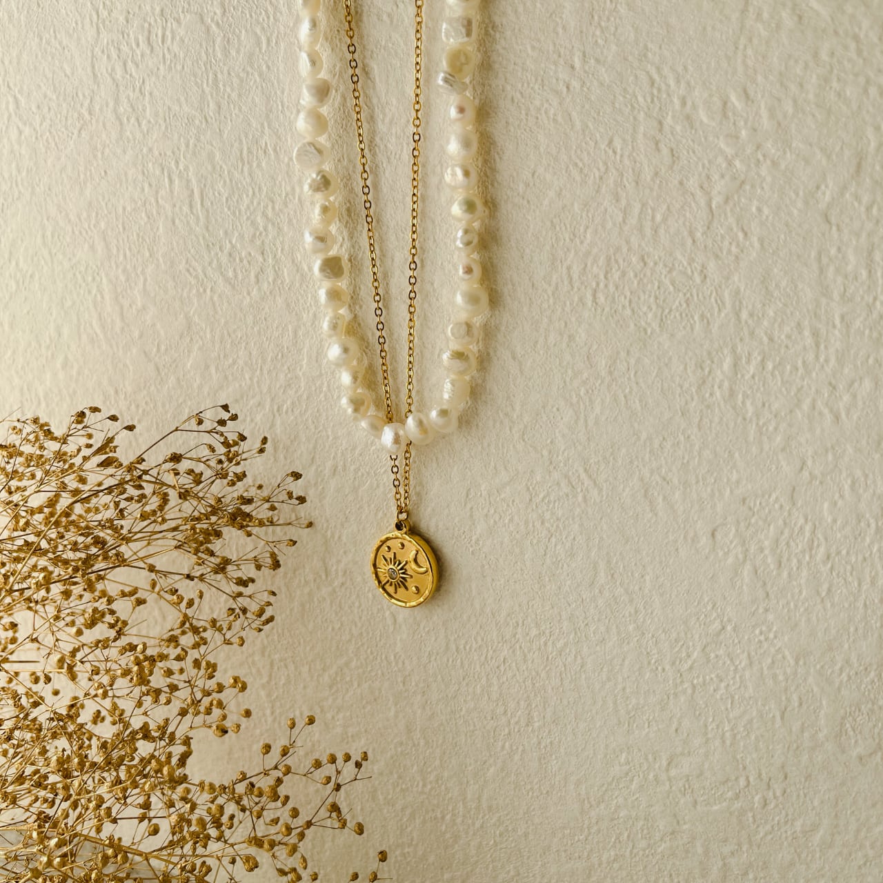 ラウンドペンダントには月と太陽のデザインが刻印されており
