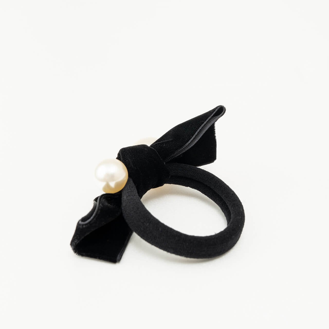 エレガントで洗練されたデザインが魅力のヘアアクセサリー。柔らかなベルベット素材のリボンに大小のパールがあしらわれた、後ろ姿も華やかに見せてくれるヘアゴムです。デイリーから特別なシーンまで幅広く活躍します。