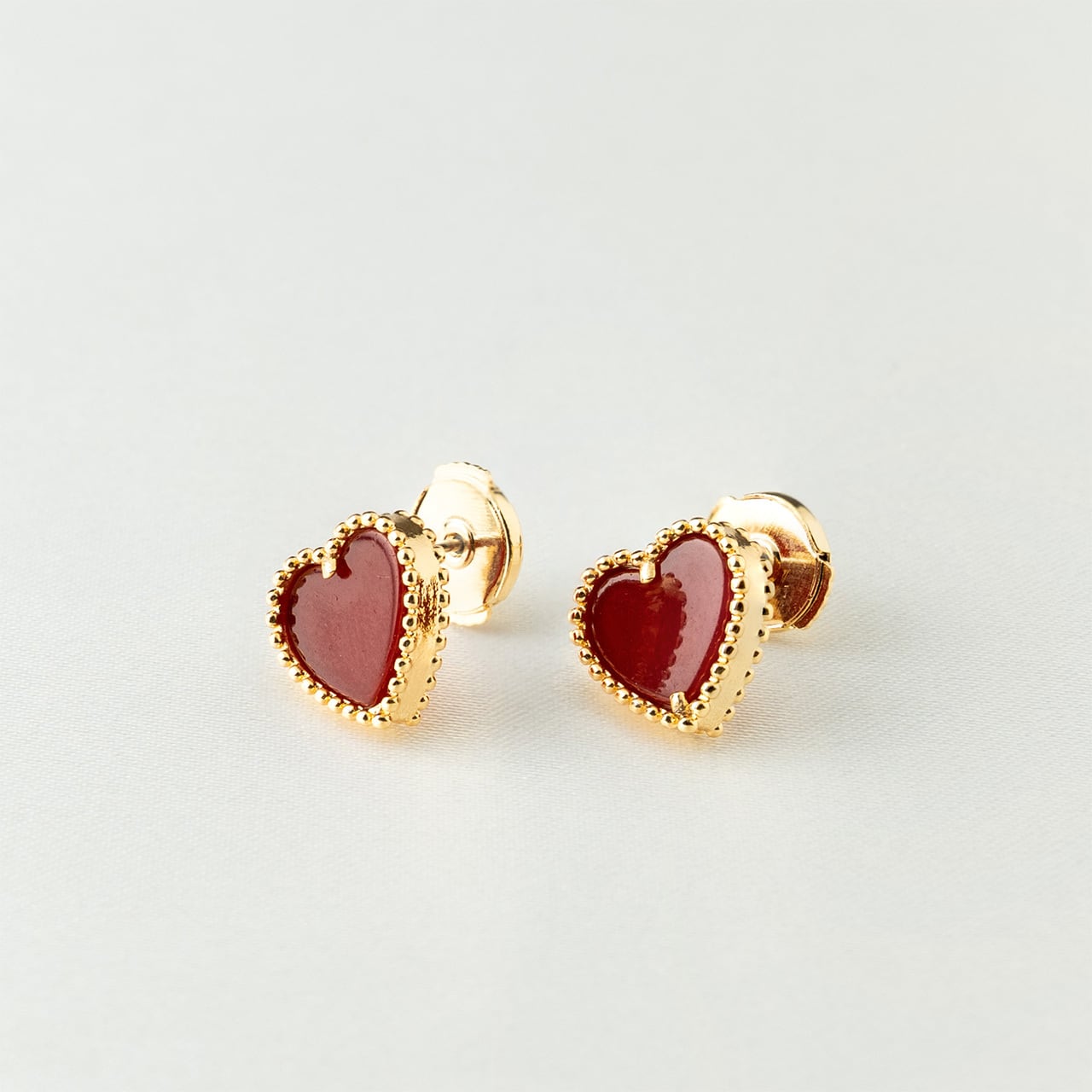 見る角度によって微妙に色合いが変化する赤いハート部分が特徴のピアス。光を受けるたびに動きのある表情を見せ、シンプルながらも印象的なデザインです。ゴールドの縁取りが上品さを引き立て、大人の女性にもぴったりのアイテムです。